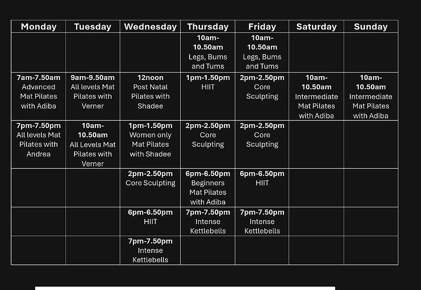 To enhance your fitness routine, consider integrating two high-intensity interval training (HIIT) sessions each week with a core sculpting and intense kettle bell session. Together with one Pilates class and a monthly one-on-one fitness and nutrition consultation. This combination will not only boost your strength and endurance but also improve your flexibility and overall well-being.